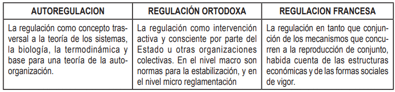 Tres son las acepciones que de la teoría de la regulación se han elaborado: