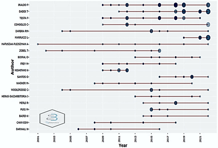 Esta gráfica nos permite ver como entre el año 2000 y el año 2006 hay comportamiento en la producción académica por autores variable pero creciente (entre 0 y 20). Al final de esta primera década del nuevo siglo se presenta una caída no considerable pero si observable (35 aprox). La segunda década del siglo XXI presenta un comportamiento con marcada tendencia al crecimiento en la producción académica relacionada con ISO 14001 siendo el año 2019 de mayor indicador con 78 obras por encima de 2022 en el cual hubo una caída producto de factores que pudieron afectar la dinámica comercial y la adopción de NTA.