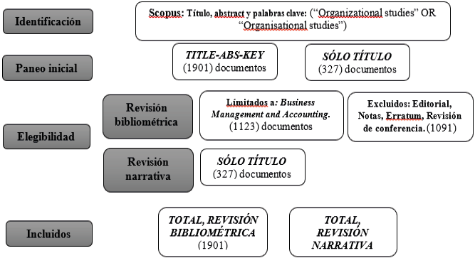 Metodológicamente hablando, en esta revisión, se utilizó la base de datos Scopus® para identificar documentos relevantes de alta calidad. Se limitó la búsqueda a documentos publicados en revistas indexadas por Scopus, dado que realizando una comparación con bases de datos como WoS se encontró que Scopus incluía no sólo las investigaciones que tenía ésta, sino que agregaba estudios adicionales; el período de estudio comprendido entre 1973 y 2023 se determinó teniendo en cuenta que fue desde 1973 el año en que se materializó las primeras publicaciones sobre los estudios organizacionales. El enfoque principal es el de los Estudios Organizacionales, un campo de conocimiento interdisciplinar que investiga y comprende los fenómenos relacionados con las organizaciones.