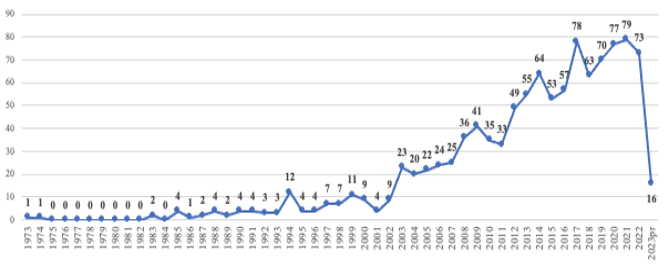 Figura 2. Producción científica total sobre estudios organizacionales (1973- 2023)