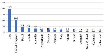 Respecto a la filiación de los autores de acuerdo con su país de vinculación, la Figura 3 muestra cómo el país que registra mayor número de publicaciones sobre estudios organizaciones es Estados Unidos con 195 divulgaciones (18% del total), seguida por Reino Unido con 102 publicaciones (9% del total), Brasil y Canadá principalmente; en Colombia se registran 11 publicaciones.