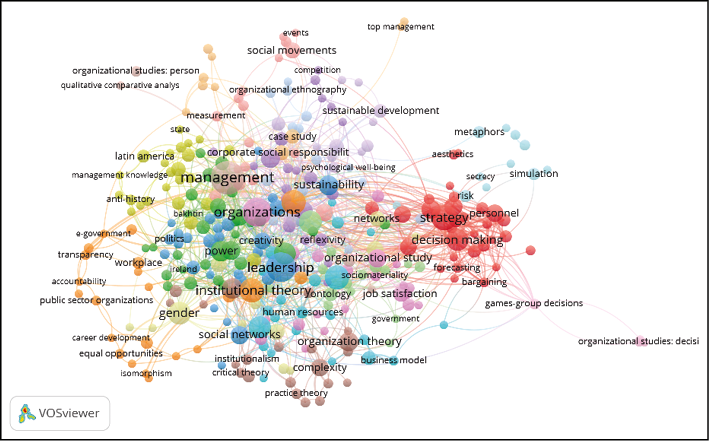 Por último, se realizó un análisis de coocurrencia de palabras clave para examinar los temas centrales en los estudios organizacionales, para determinar la frecuencia de palabras juntas en los títulos, resúmenes o palabras clave de los documentos extraídos de las bases de datos. También se usa el análisis temporal de palabras conjuntas para estudiar la distribución de documentos asociados a una palabra clave en el tiempo, identificando así los temas de investigación recientes y actuales en el campo analizado.