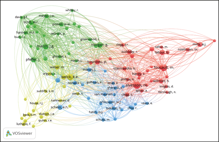Los datos bibliográficos asociados, 1091 y 327 documentos resultantes de la búsqueda en Scopus, se guardaron respectivamente cada uno en un archivo de Excel para su análisis; más adelante se importaron a los softwares bibliométricos, dependiendo del tipo de revisión que fuera a realizar. Los datos extraídos de la base de datos incluyeron autores, afiliaciones, año de publicación, palabras clave, abstract e información de referencias. Se utilizaron estadísticas descriptivas para definir el tamaño, la trayectoria y la distribución geográfica de las publicaciones en la base de datos revisada. En cuanto al análisis bibliométrico, se realizaron análisis de citaciones y cocitaciones para medir el impacto y la influencia de autores y documentos en el campo de los estudios organizacionales (Echeverri y Vieira, 2022). El análisis de citaciones evalúa el impacto de los documentos de la base de datos revisada, calculando el número de veces que cada documento o autor ha sido citado en otros documentos (Köseoglu, 2016).