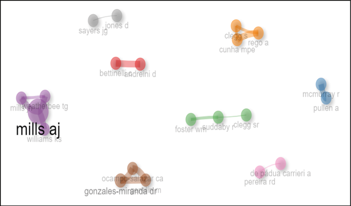 Por su parte, la Tabla 2 muestra el ranking de las fuentes bibliográficas con mayor número de documentos publicados. Es de destacar la Revista estadounidense Management Science del Instituto de Investigación Operativa y Ciencias de la Gestión, revista académica centrada en la investigación científica sobre la teoría y la práctica de la gestión, que ocupa el primer lugar con 77 publicaciones sobre estudios organizacionales. En una segunda escala se encuentran las revistas: Organization Studies (36 publicaciones) del Grupo Europeo de Estudios de Organización (EGOS), y la Revista De Administração De Empresas de la Escuela de Administración de Empresas de la Fundación Getulio de Sao Paulo- Brasil (32 publicaciones).