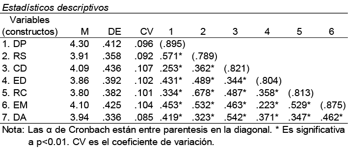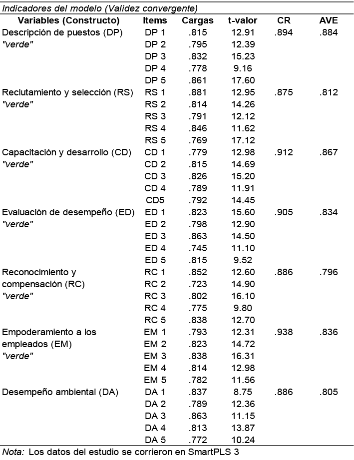 El análisis descriptivo de muestra en la Tabla 4, en la que se aprecia que, en una escala máxima de 5, los valores de la media de las variables en la muestra oscilan entre 3.80 a 4.30, lo que indica que la mayor parte de los participantes muestra perciben que las prácticas “verdes” de recursos humanos tienen impacto en el desempeño ambiental de la organización estudiada. La desviación estándar va de un valor de 0.336 a 0.436 lo cual indica una dispersión baja de los datos. Además, los valores α de Cronbach que van de 0.789 a 0.895 en las variables de estudio, están por arriba del criterio de 0.7, lo que de acuerdo con Hair et al. (2017) y Pérez (2014) indica que muestran una adecuada consistencia interna.