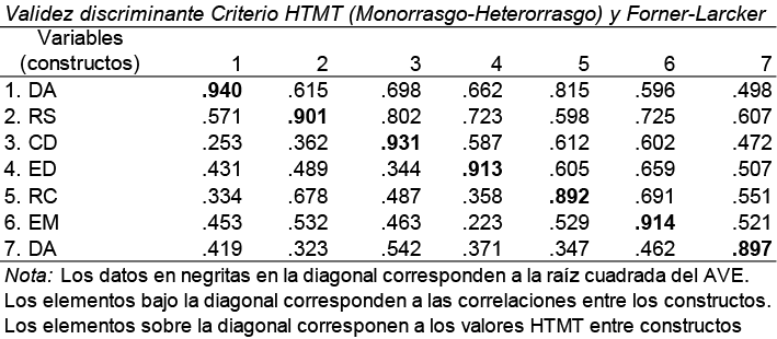 Además, se analizó la validez discriminante empleando el criterio HTMT -monorrasgo-heterorrasgo-, el cual indica que para valores menores a 0.85 se asume validez discriminante de acuerdo con lo comentado por Henseler et al. (2015). En esta investigación se muestran los datos obtenidos en la Tabla 3 -diagonal superior-, en la que se puede apreciar que todos los valores están por debajo del criterio especificado, lo que indica que los ítems de un constructo en particular tienen mayores correlaciones entre sí que con ítems que pertenecen a otros constructos-.