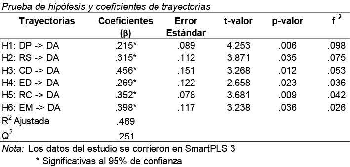Con los datos obtenidos se corrió el análisis de trayectorias, los resultados pueden apreciarse en la Tabla 5. Se utilizó un procedimiento de bootstraping con un remuestreo de 10,000 de acuerdo con la recomendación de Hair et al. (2017), Henseler et al. (2015) y Pérez (2014) para obtener los valores de β, t y p a un nivel de 95% de confianza.
