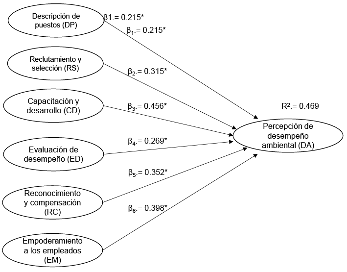 Como se esperaba en las hipótesis planteadas se aprecia que las seis variables -constructos- estudiadas muestran una influencia positiva y significativa sobre el desempeño ambiental de la organización estudiada en la Ciudad de México: DP (H1, β= 0.215, p=0.006<0.005), RS (H2, β= 0.315, p=0.035<0.005); CD (H3, β= 0.456, p=0.012<0.005), ED (H4, β= 0.269, p=0.023<0.005), RC (H5, β= 0.352, p=0.006<0.009), EMP (H6, β= 0.398, p=0.036<0.005). Lo cual indica que las prácticas de gestión “verde” de recursos humanos tienen una aportación positiva para la organización en su intención de mejorar el desempeño ecológico.