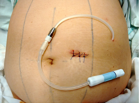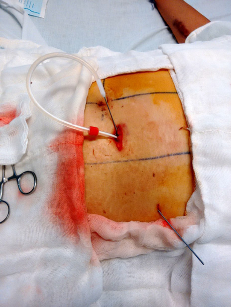 Debe medirse el catéter, desde el sitio de inserción marcado y el dispositivo de dacron proximal, hasta el borde superior de la sínfisis del pubis, donde se recomienda para una correcta colocación de la punta del catéter en la pelvis. Se realiza una incisión de unos 2 cm en el sitio de la colocación utilizando un bisturí con hoja No. 15. Utilizando una pinza de Kelly recta, se realiza una disección roma hasta la fascia aponeurótica del recto anterior del abdomen. En este lugar, puede hacerse una pequeña incisión con un bisturí con hoja No. 11. Mientras se dice al paciente que realice una maniobra de Valsalva, se coloca un introductor romo hasta cavidad peritoneal (figura 2). Se deja el introductor dentro de la cavidad, para causar un trayecto y dilatar el sitio de introducción, Si no hay líquido de ascitis, de puede instilar unos 500 ml de solución salina hacia hueco pélvico (a través del introductor) para crear espacio inter-intestinal y en hueco pélvico y así facilitar la colocación del catéter.