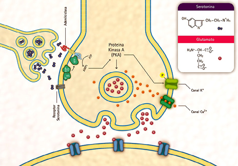 La fosforilación de proteínas mediadas por PKA y PKC aumenta la liberación de neurotransmisor de las neuronas sensoriales a través de dos mecanismos. En el primero, la PKA fosforila el canal de K+ ocasionando su cierre, este proceso expande el potencial de acción y aumenta la entrada de calcio a través de canales dependientes de voltaje, este aumento de calcio favorece la liberación del neurotransmisor (fig. 2). En el segundo mecanismo, por acción de PKC aumenta el funcionamiento de la maquinaria de liberación del neurotransmisor, es decir, se activa la fosforilación de motores moleculares que favorecen el desplazamiento de las vesículas y su fusión con la membrana para el proceso de exocitosis. La facilitación presináptica en respuesta a la liberación de serotonina, por la descarga eléctrica en la cola, perdura por un período de algunos minutos; la repetición del estímulo nocivo puede fortalecer la actividad sináptica durante días [1, 26, 37].