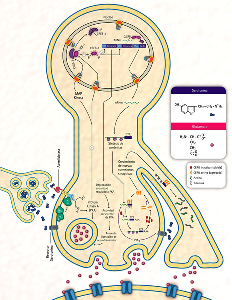 La conversión de la memoria de corto plazo en memoria a largo plazo se denomina consolidación y requiere de la síntesis de ARNm y de proteínas en las neuronas del circuito (fig. 3). Se requiere, entonces, la expresión de genes específicos para la formación de memoria a largo plazo. La transición de una a la otra depende del aumento prolongado de AMPc que sigue a las aplicaciones repetidas de serotonina y a su vez, el AMPc genera activación prolongada de la PKA, permitiendo que las subunidades catalíticas de la kinasa se transloquen al núcleo de las neuronas sensoriales. Por acción de la PKA, también se activa otra proteína quinasa, la proteína quinasa activada por mitógeno (MAPK), quinasa asociada con el crecimiento celular. En el núcleo la subunidad catalítica de la PKA fosforila y activa al factor de transcripción llamado proteína de unión al elemento de respuesta al AMPC (CREB-1), el cual a su vez se une a un elemento del promotor llamado elemento de reconocimiento al AMPc (CRE) [1, 26, 29, 40].