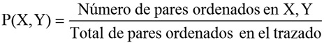 Probabilidad de los pares ordenados: fracción de números de pares ordenados que se encuentran dentro de un rango dado respecto al total de pares ordenados del trazado, donde x y y son múltiplos de 5.
