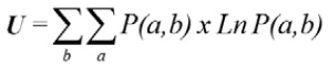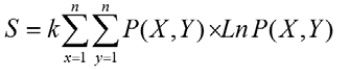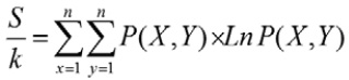 Entropía de ocupación de un atractor: suma de los productos de las probabilidades de los pares (x, y) hallados en la ecuación anterior con sus logaritmos, siendo p es la probabilidad para un rango determinado en múltiplos de5 (x, y), k es la constante de Boltzmann y n corresponde al número total de frecuencias encontradas en el registro: