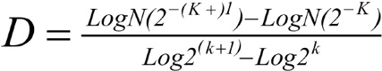 En donde D corresponde a la dimensión fractal; N corresponde al número de cuadros ocupado por el objeto en la cuadricula de grado de partición k.