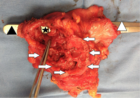Figura 2. Se muestra la pieza quirúrgica resecada. Triángulo negro la primera porción del duodeno, triángulo blanco el antro pilórico, estrella negra el sitio de fístula colecistoduodenal, las flechas blancas muestran el borde de la pared de la vesícula biliar.