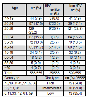 Table 1 shows the distribution of genotypes found in relation to oncogenic risk, with genotypes 6,11,16,18,31,33,35,42,45,51,52,53,58,59,61,81. This table also shows the distribution of findings found according to age group.