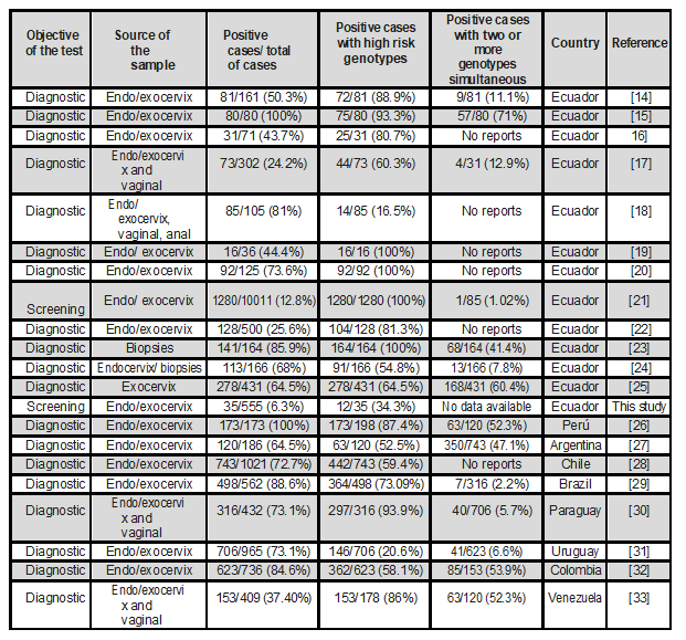 Firstly, it is important to note that there are very few diagnostic screening studies conducted in healthy women. Comparing the studies published in Latin America and Ecuador, only two papers on diagnostic screening were observed and the rest are on the diagnostic confirmation of HPV. Screening diagnostic studies are rare, although, they should be done to understand the local epidemiology of the disease.