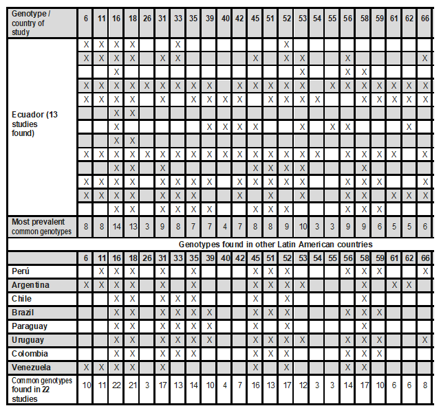 The objective of this study is to show the prevalence of HPV genotypes in Ecuadorian mestizo women [13], in comparison with other studies at Latin America [14-33] .