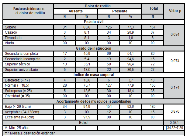 En cuanto a los factores intrínsecos, el estado civil resultó estadísticamente significativo (p=0,034). Sin embargo, las variables edad, grado de instrucción, índice de masa corporal y acortamiento de los músculos isquiotibiales fueron estadísticamente no significativas (ver Tabla 1).