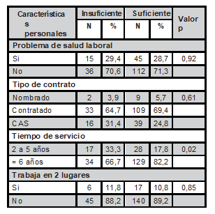 Se observó que del total de enfermeras con suficiente desempeño, el 66,7% presentaron un tiempo de servicio ≥ 6 años, siendo las diferencias significativas (Valor p=0,02) con respecto a las enfermeras con insuficiente desempeño, mayor detalle se observa en la Tabla 1.