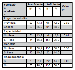 Se observó que del total de enfermeras con suficiente desempeño, el 96,2% manifestaron que realizaron especialidad, siendo las diferencias significativas (valor p=0,01) con respecto a las enfermeras con insuficiente desempeño; también se observó que en el grupo de enfermeras con insuficiente desempeño, el 98,0% expresaron que no hacen docencia universitaria, las diferencias fueron significativas (valor p=0,02); mayor detalle se observa en la Tabla 2.