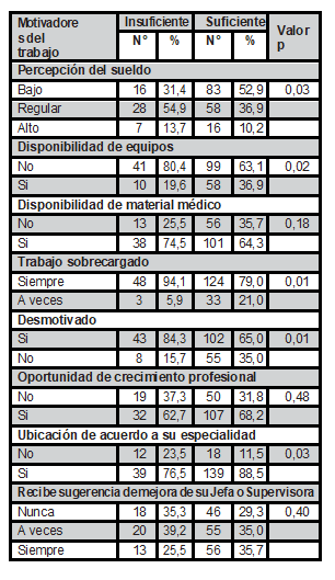 Del total de enfermeras con insuficiente desempeño, el 54,9% perciben que su sueldo es regular. La mayoría de enfermeras con insuficiente y suficiente desempeño, manifestaron que no hay disponibilidad de equipo, que siempre existe sobrecarga de trabajo, la mayoría expresaron que se sintieron desmotivados y que están ubicados de acuerdo a su especialidad; en todos los casos las diferencias fueron significativas (valor p<0,05), mayor detalle se observa en la Tabla 3.