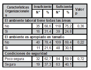 En cuanto las características laborales, se encontró que la media del tiempo de servicio es de 11 años, el 78,8% tuvieron 6 a más años de servicio, el 5,3% fueron nombrados, el 68,3% contratados a plazo indefinido y 26,4% a contrato temporal. En formación académica, el 93,8% acreditaron especialidad, 15,4% maestría, el 11,1% realizó docencia. Sobre los factores motivadores del trabajo, se mostró que el 47,6% perciben que el sueldo es bajo, 41,3% regular y 11,1% bueno. El 63,0% manifiesta sobrecarga laboral. El 32,7% señalaron que cuentan con equipamiento suficiente y 45,7% expresaron que disponen de material necesario y el 14,4% señaló que su ubicación no es acorde a la especialidad. En las características organizacionales, el 70,2% manifestaron que no reciben capacitaciones por parte de la institución laboral. En las características de la influencia de la jefatura, se observó que el 37,0% perciben presión laboral de la jefatura de enfermería y el 64,9% percibe que la jefatura de enfermería no brinda facilidades en el horario de trabajo.