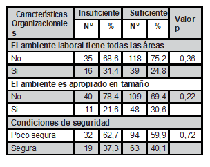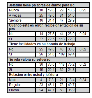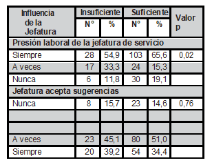 Del total de enfermeras con insuficiente desempeño, la mayoría expresaron que percibieron presión laboral por parte de la jefatura del servicio de enfermería (valor p=0,02) y no tiene facilidades en su horario de trabajo (valor p=0,02); mayor información se detalla en la Tabla 5.