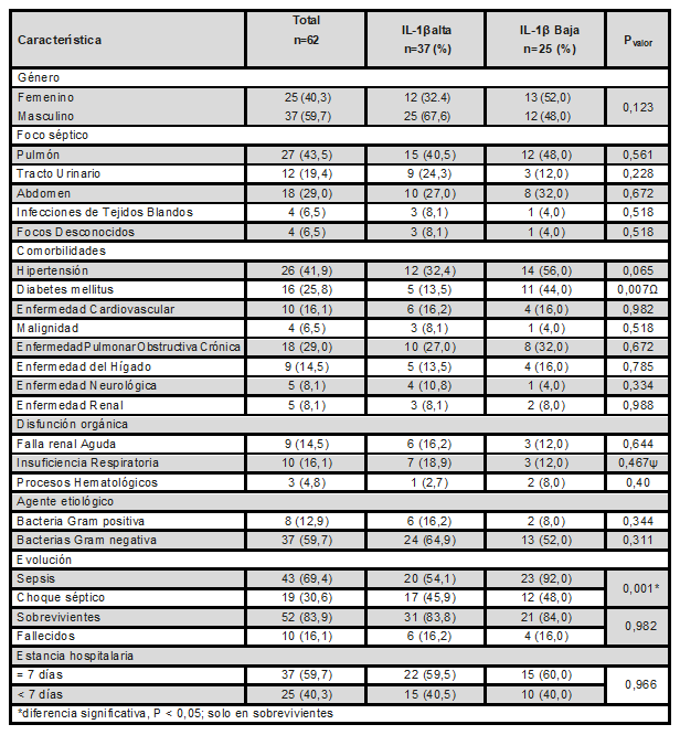 La población control registró un valor promedio de 50,0 pg/ml de IL-1β (20,0-75,0), los valores por encima de este promedio fueron considerados altos en los pacientes con sepsis o choque séptico. Las características clínicas de los pacientes en relación a los niveles de la IL-1β se presentan en la tabla 3.