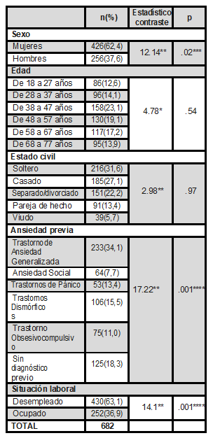 Tabla 1. Descripción de datos socio-demográficos y clínicos de la muestra *Estadístico ANOVA (F); **Estadístico χ2; *** p < ,05; **** p < ,01