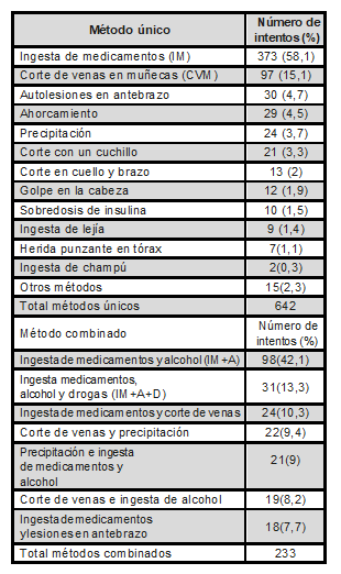 Tabla 2. Datos específicos sobre método (único/combinado) de intento de suicidio (periodo 26 meses)
