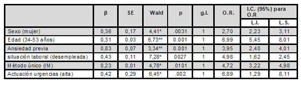β = coeficiente beta; SE = error Estándar; Wald = estadístico de potencia de contraste; p = Nivel de significación; *p<0,05 ** p<0,01; ns = no significativo; O.R. = Odds Ratio o resultado de la ecuación de regresión-Exp.(β).