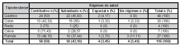 Tabla 3. Tipos de cáncer clasificados según el régimen de salud del paciente