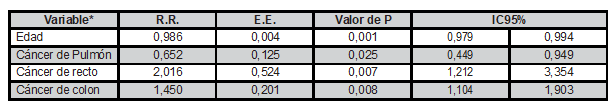 R.R., riesgo relativo; E.E., error estándar; IC95%, intervalo de confianza 95% * solo se presentan las variables que presentaron un valor de P < 0,05 Fuente: elaboración propia.