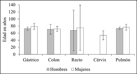 El promedio de edad de los pacientes incluidos en el estudio fue de 72,3 años (SD = 14,4). El tipo de cáncer más frecuente a temprana edad fue el de cérvix, cuya edad promedio fue de 53,7 años (SD = 13,6), mientras que el encontrado en pacientes de mayor edad fue el gástrico, que se presentó en mujeres cuya edad promedio eran los 78,9 años (Figura 2), lo anterior sin observar diferencias significativas entre el género del paciente y la edad de presentación de la enfermedad (P > 0,05).