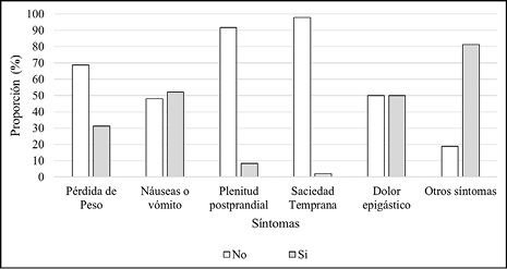 Otros síntomas de cáncer gástrico como plenitud postprandial (8%), y saciedad temprana (2%) presentaron una baja proporción similar a lo reportado por Wanebo et al., [14] y Bowrey et al., [21]. Por el contrario, Adrada et al.,[12] y Craanen et al., [22] reportaron proporciones más altas.