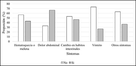 Los síntomas de cáncer de colon encontrados en mayor proporción fueron dolor abdominal (66%), cambio en los hábitos intestinales (46%) y hematoquecia o melena (43%), similar a lo reportado por Majumdar et al., [25]. Leiva et al., [17] encontraron una mayor proporción del sangrado rectal. Ferreira et al.,[26] reportaron los valores más altos para dolor abdominal.