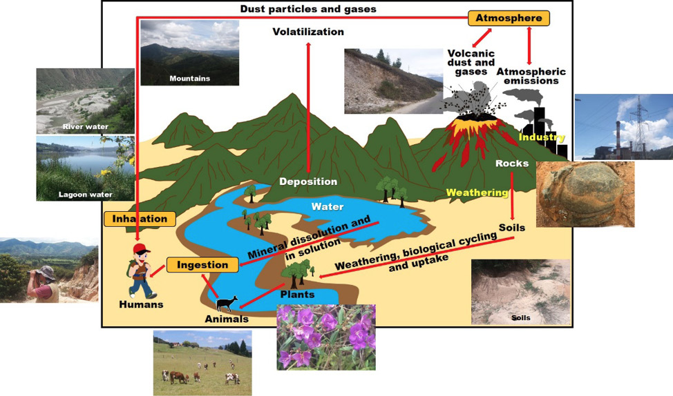 It is well known that human beings take advantage of natural resources to satisfy their needs no matter what happens to the environment and its impacts (exposure to toxic levels of trace elements, deficiency of essential trace elements, exposure to mineral dusts or radioactivity) on public health, which is the object of study of medical geology (Figure 2). The advance of science and technology has allowed the opening of new lines of research that require multidisciplinary work with the participation of professionals in different areas of knowledge. Medical geology is an example of this because it proposes collaboration between two broad fields of knowledge that apparently have no relationship, such as Earth sciences and biomedical sciences. Medical geology is a field of action of the applied sciences that is becoming increasingly popular, which refers to the complex relationships between environmental factors relating to the presence of contaminnats in different geological settings, their mobility, geographical distribution and their effects on in health of humans, animals and plants health [26-29]. It is well known that the environment can affect health in different ways. However, it is necessary to understand the complex interactions between the environment and human health, which requires a multidisciplinary work in which the participation of professionals in the fields of medicine and geology is essential. According to Bunnell et al. [30], there are environmental health problems in which medical and geology professionals could interact and contribute to the search for solutions, including exposure to natural dust, radioactivity, toxic elements, toxic organic and inorganic compounds, volcanic emissions, etc. Besides, the advance of a series of tools and databases allows medical geology professionals to study vector-borne diseases, to model the dispersion of pollutants in surface and groundwater, in soils and in the air. The aims of medical geology is to identify geochemical anomalies in water, soils and air that may adversely affect health in living beings, to identify the environmental causes of problems associated with health. Through interaction with professionals in the biomedical sciences and public health, it will be possible to find solutions to prevent or minimize these problems, to establish the role of minerals and geological processes in health, to inform the public about unwarranted concerns health issues associated with minerals and geological processes, and establishing links between developed and developing countries to find solutions to environmental health problems [30]. Its field of study is complex and is shared by specialists from different areas and scientific domains, including geosciences. Therefore, it is expected that medical geology will grow in importance in the future, in order to provide humanity with the necessary resources through sustainable development, contributing to the improvement of environmental quality with concentrations that do not adversely affect human, animal and plant health [31]. Medical geology contributes extensively to scientific knowledge in medicinal and/or pathogenic potential of minerals, geochemical and epidemiological characterization of a territory to know the concentration and geographical distribution of elements and their possible relations with several diseases, influence of natural phenomena on the mobility and exposure of potentially hazardous geological materials, impact analysis of natural phenomena and antropogenic activities on environment and health to look for alternative solutions, development of strategies in the elaboration of comprehensive public policies, supporting the investigation on public health.