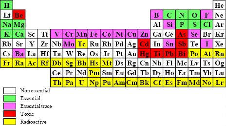 Figure 4 shows a periodic table of elements distinguishing the non essential, biologically essential, essential trace, toxic and radioactive elements. The essential elements marked in green constitute the main (something more than 97% of the living beings) and secondary (around 2.5 of the living beings) bioelements; the essential trace elements marked in pink, sometimes called temporary bioelements, are bioelements present in small quantities (less than 0.5%) in living beings, although their absence or excess can be harmful to the organism, becoming pathological. There are elements which are dangerous because of their inherent toxicity (toxic elements marked in red) and those that present a risk because of extreme reactivity (radioactive elements marked in yellow).