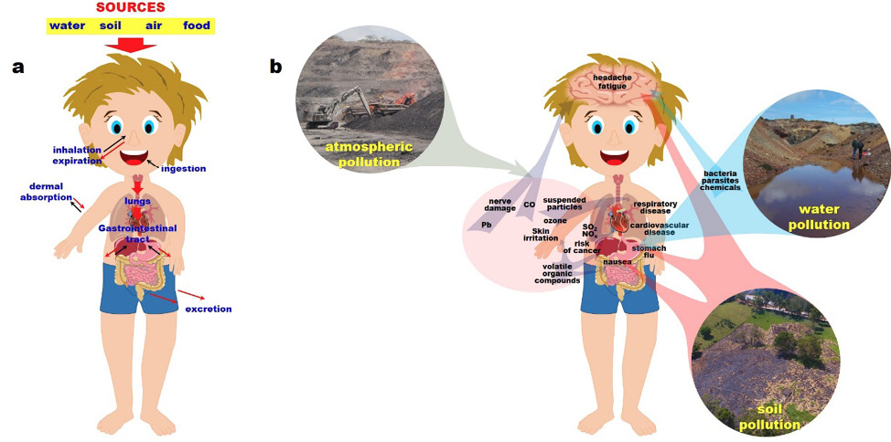 Figure 5. (a) Sources, intake pathways, and uptake of minerals by the human body. (b) Effects of pollution on human health