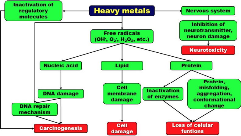 Heavy metals are assimilated by living things, causing adverse health effects at the cellular level [65]. They can affect the central nervous system, deteriorate the blood system and organs such as the lungs, kidneys, liver, among others, promote diseases such as Parkinson’s and Alzheimer’s, damage nucleic acids, mutation or cancer [106-107]. The various sources of heavy metals are summarized by Morais et al. [64] in Figure 6. Living organisms can ingest heavy metals through consumption of contaminated animal and plant-based foods or water, inhalation of contaminated air, or occupational exposure in the workplace [66]. The chain of heavy metal contamination begins from industry to the atmosphere, soil, water and food, and ends in humans [108]. Heavy metals can enter the body through the gastrointestinal route, by inhalation or absorption through the skin. Most heavy metals are distributed in the body through the blood to the tissues [109]. They have no beneficial effects in humans, and there is no known homeostasis mechanism for them [110]. They are generally considered the most toxic to living beings; the adverse health effects associated with exposure to them, even at low concentrations, are diverse and include, but are not limited to, neurotoxic and carcinogenic actions [111]