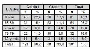 En la Tabla 2, se evidencia que existió un predominio de la hipertensión arterial grado I para un 60,2%, en edades comprendidas entre 60 y 64 años de edad, para un 22,4 %.
