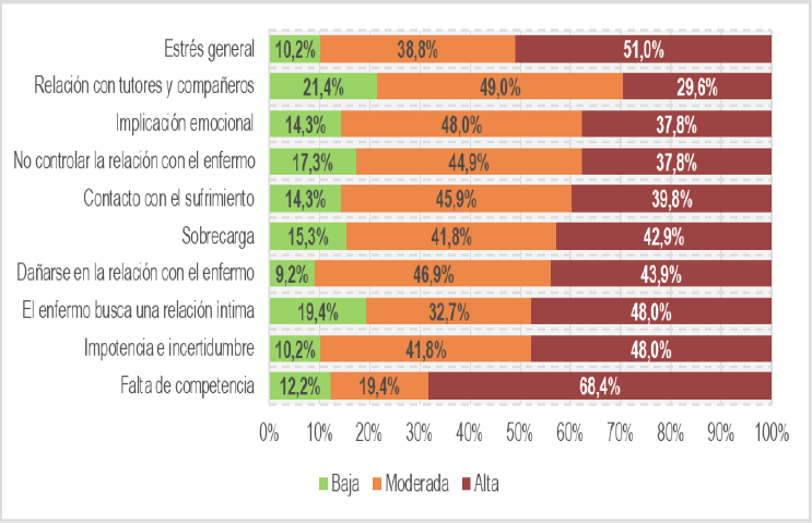 Sobre los demás aspectos, la mayoría de estudiantes presentó una percepción de estrés principalmente de carácter moderado. En su orden, las más críticas fueron las relaciones con tutores y compañeros (49%), la implicación emocional (48%), el hecho de dañarse en la relación con el enfermo (46,9%), estar en contacto con el sufrimiento (45,9%), no controlar la relación con el enfermo (44,9%) y, con la menor proporción, la sobrecarga (41,8%) (Figura 1).