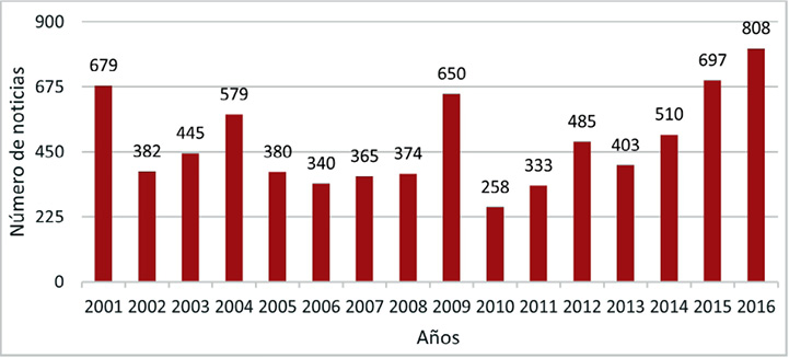 Figura 1. Distribución anual de los textos periodísticos seleccionadas en el periodo de estudio (2001-2016).