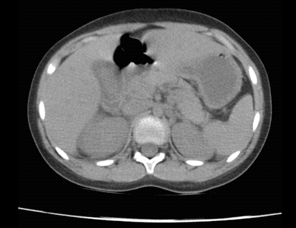 Figura 2. Tomografía de abdomen contrastada en la que se visualiza vesícula biliar de forma y tamaño normal con líquido perivesicular