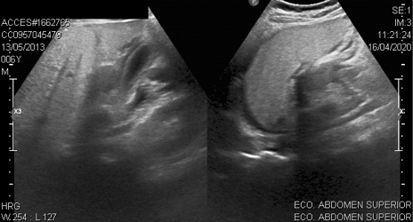 Figura 3. Estudio ecográfico en el que se visualiza vesícula biliar poco distendida con líquido libre perivesicular