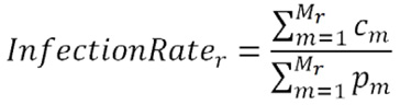 A taxa de contágio de uma região, é determinada pelo quociente da soma do número de casos confirmados da doença, em cada município da região (cm), pela soma do número de habitantes de cada município da mesma região (pm). Como resultado, é obtido um valor que varia de 0 a 1 (0% a 100%), indicando a porcentagem de habitantes infectados pelo COVID-19.