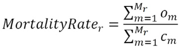 A taxa de mortalidade de uma região é dada pelo quociente da soma do número de mortes em cada município da região (om), pela soma do número de casos da doença em cada município da mesma região (cm). Como resultado, é obtido um valor que varia de 0 a 1 (0% a 100%), que indica a porcentagem de pessoas infectadas que morreram.