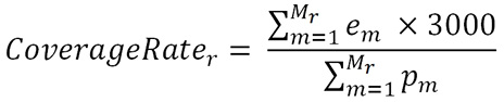 A taxa de cobertura para equipes da ESF em uma região é dada pelo quociente da soma do número de equipes em cada município da região (em), multiplicado por 3000 (número médio de pessoas registradas por cobertura de equipe) [18] pela soma das populações dos municípios dessa região (pm). O resultado é um valor que varia de 0 a 1 (0% a 100%) e indica quanto (percentual) a região está de acordo com o esperado em relação ao número de equipes da ESF [18] (podendo ter um valor maior que 100% em casos onde a relação é maior do que uma equipe para cada 3000 habitantes).