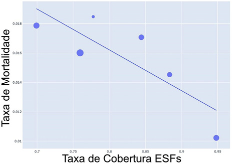 Com relação às taxas de mortalidade, não foi possível observar o mesmo comportamento quando relacionando os municípios com a taxa de cobertura da ESF. Este comportamento pode ser causado pelo fato de cidades menores dependerem de atendimento especializado nos centros metropolitanos. Por isso, foi realizada a correlação da taxa de mortalidade com a cobertura das ESFs por mesorregião, conforme a Figura 2.